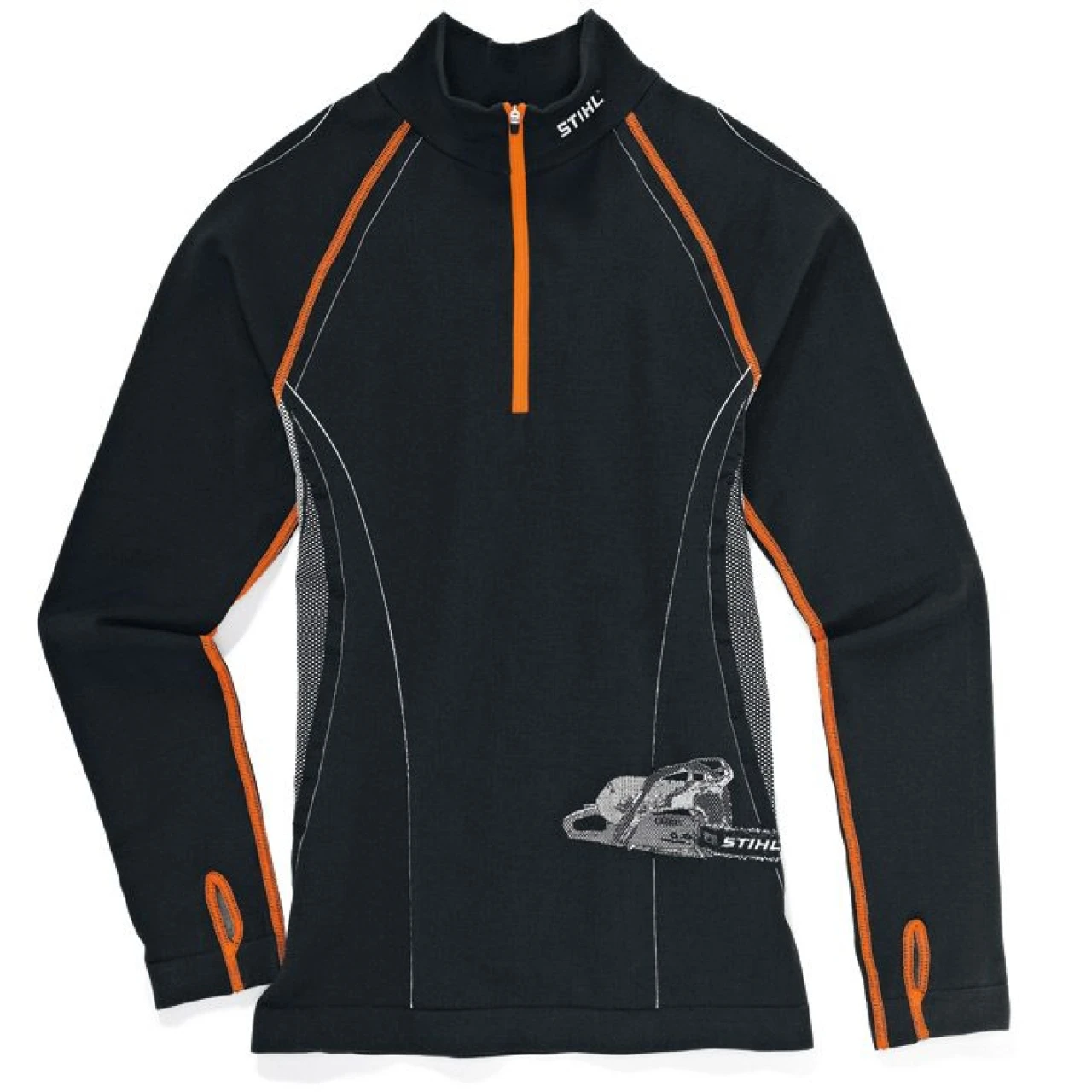 Shirt mit großem Motorsägenmotiv, Reißverschluss und Daumenschlaufe. Eine Rippenstruktur polstert an Schultern, Ellenbogen und Unterarmen.